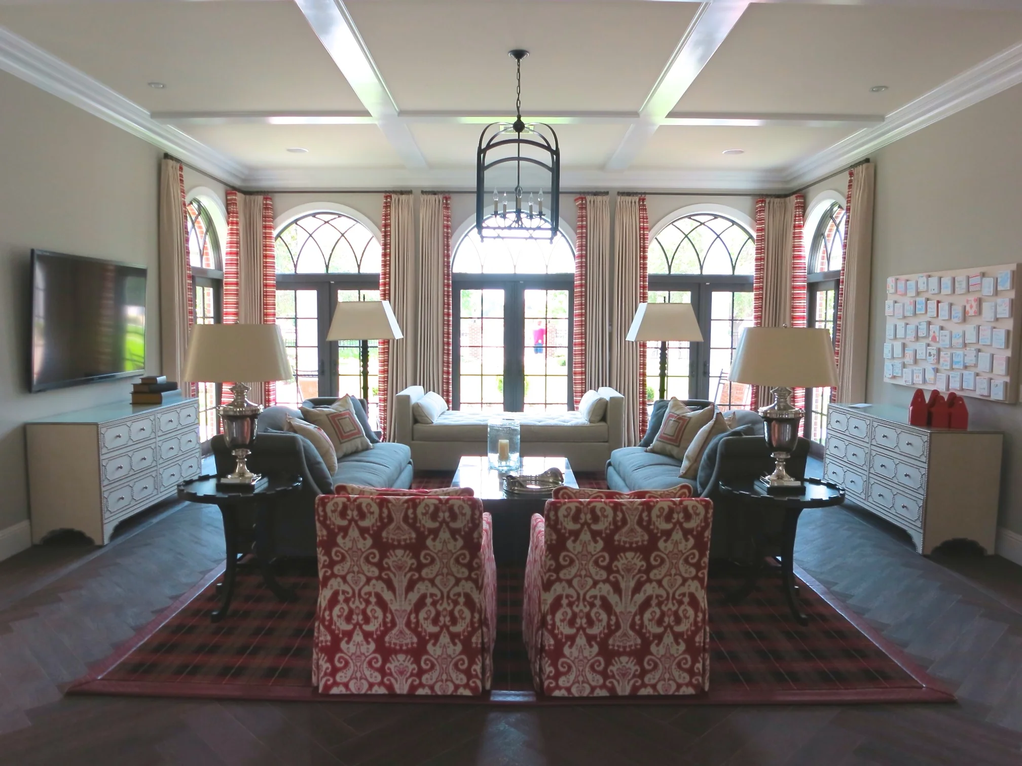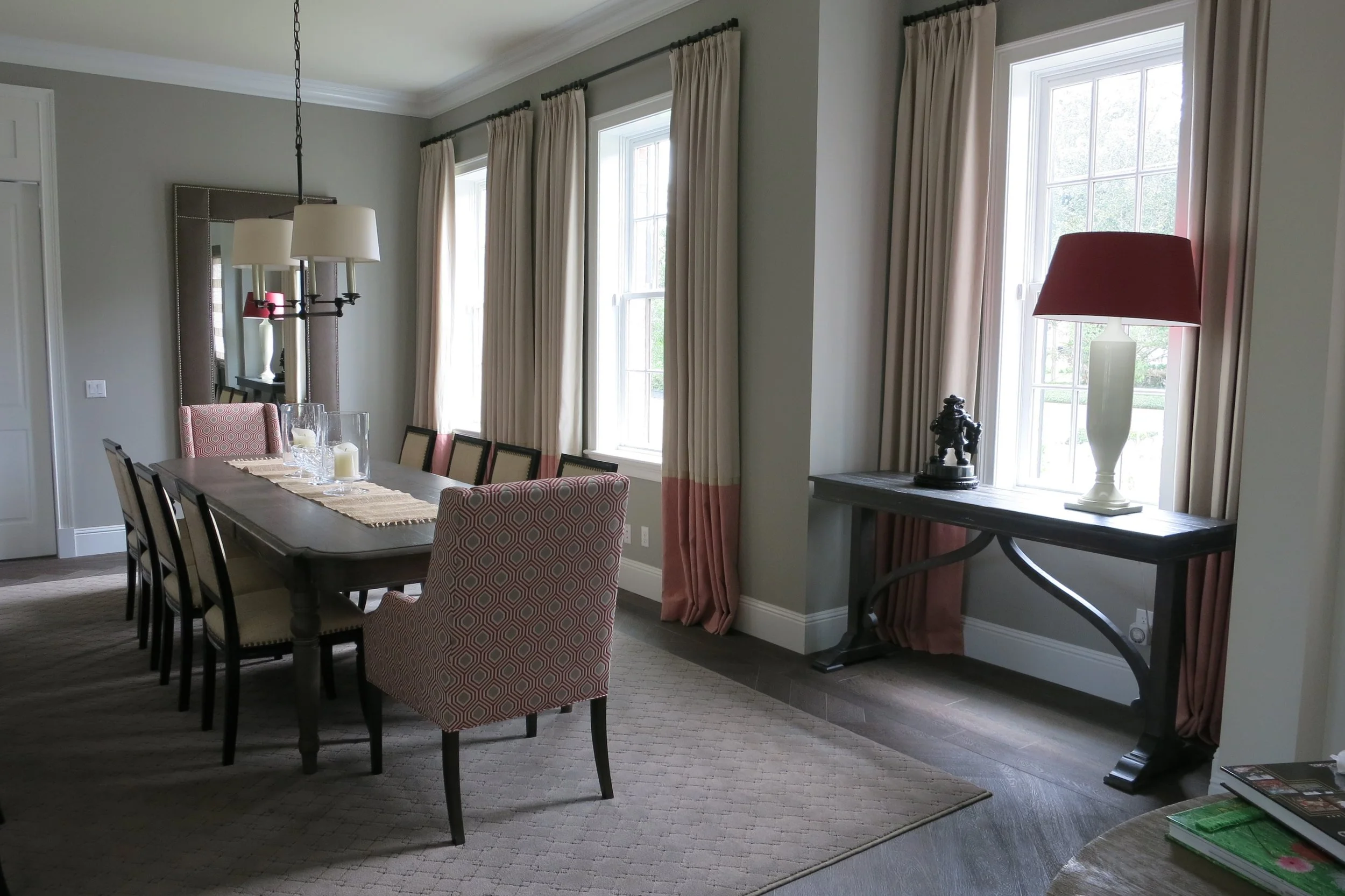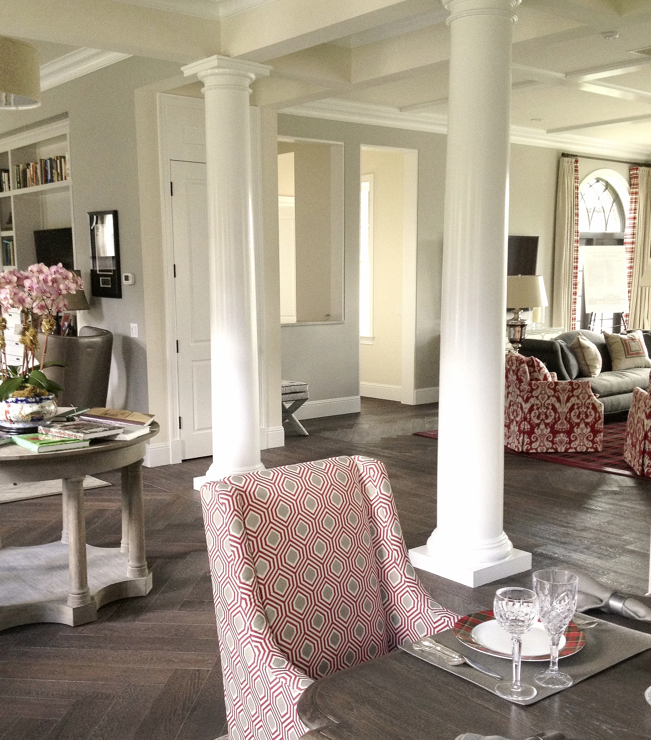 This on-campus home for the president of a prestigious private school was designed to accommodate both academic functions and family life. The color scheme is exclusively in school colors and the finishes, furnishings and artwork designed to highlight school spirit.