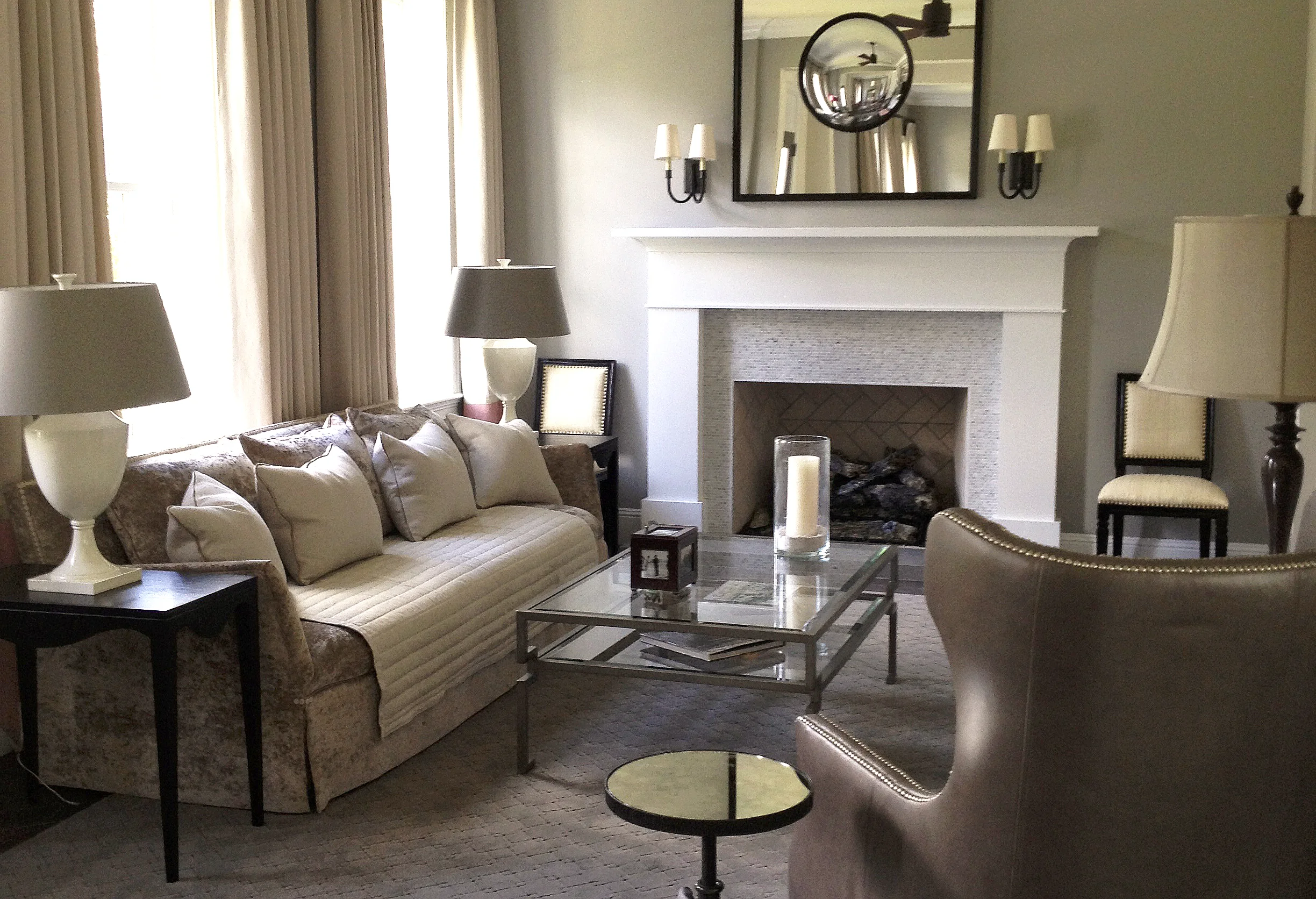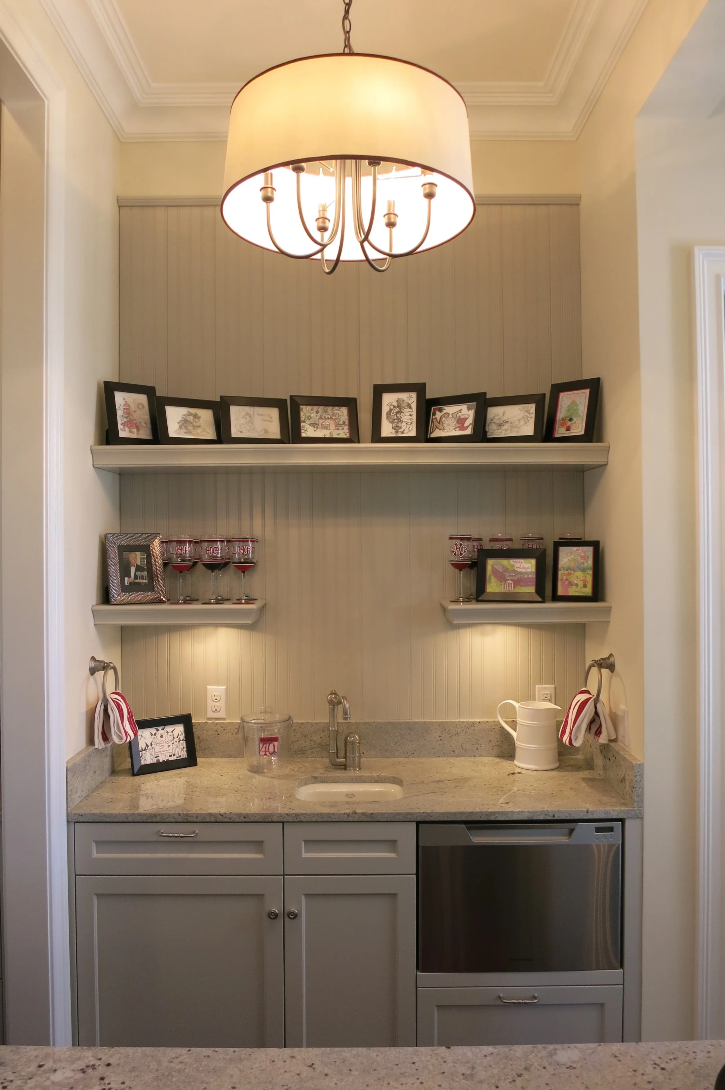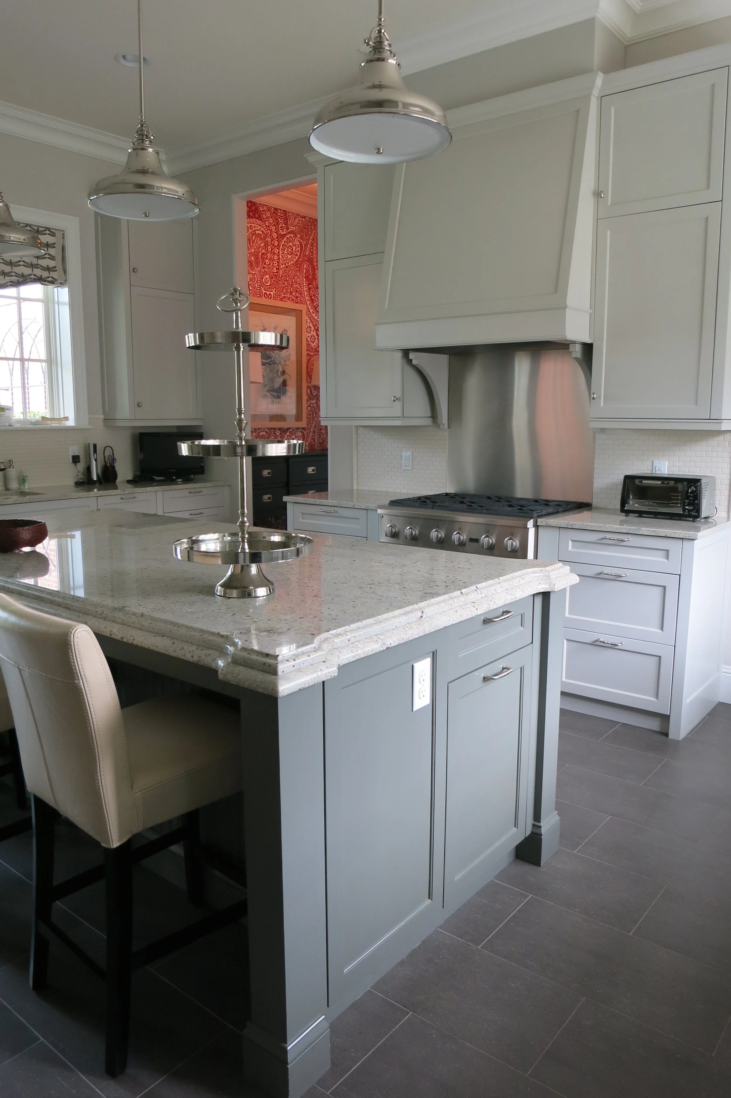 This on-campus home for the president of a prestigious private school was designed to accommodate both academic functions and family life. The color scheme is exclusively in school colors and the finishes, furnishings and artwork designed to highlight school spirit.